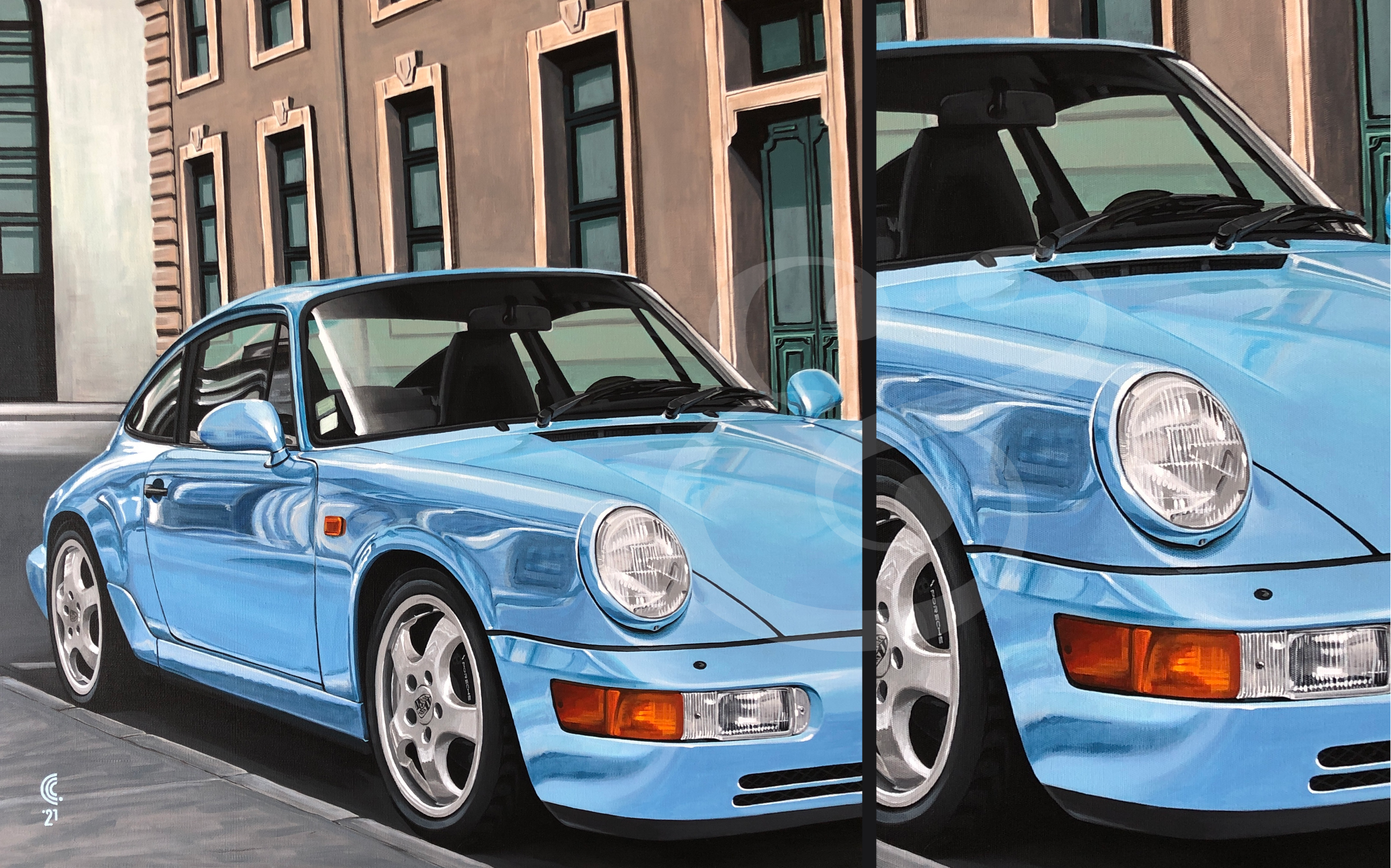 Original acrylic painting on canvas of a Porsche 911/964 Horizontblau metallic. It ships in a wood crate and is accompanied by a certificate of authenticity. Get in touch with us for additional details, or payment and shipping information.